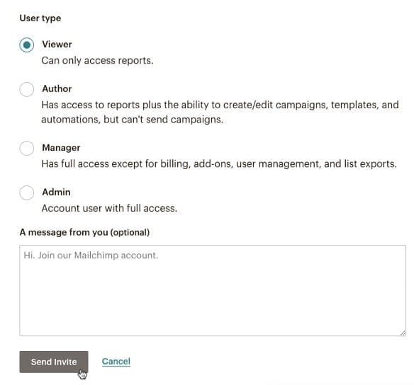 Wanneer je een gebruiker toe wilt voegen aan je Mailchimp account zul je een aantal stappen moeten doorlopen. Deze stappen leggen we uiteraard graag aan je uit. Mailchimp heeft 5 levels van toegang toegevoegd voor gebruikers, namelijk: Viewer, Author, Manager, Admin, en Owner. Je kunt alleen nieuwe gebruikers toevoegen wanneer je Admin of Owner bent. Onderstaand vind je de stappen die je moet doorlopen om een nieuwe gebruiker toe te voegen: