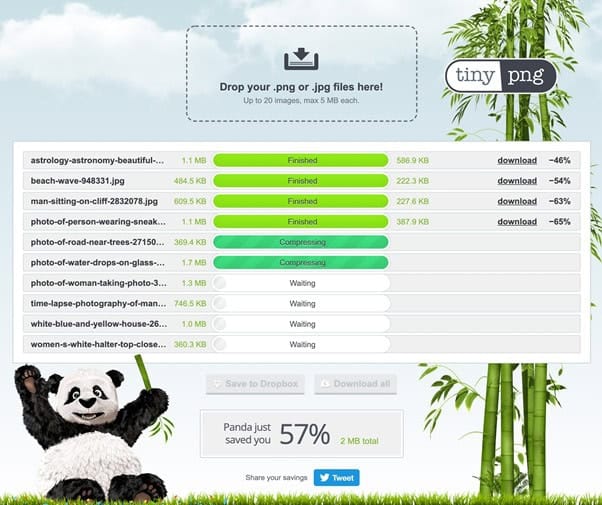 TinyPNG is één van de handige tools bij het comprimeren van een afbeelding. Er kunnen tot 20 afbeeldingen tegelijkertijd via de website gecomprimeerd worden door ze simpelweg de website in te slepen. Je ziet direct welke afbeeldingen al gecomprimeerd zijn en welke er nog bezig zijn. Wat je hebt bespaard aan bestandsgrootte is ook direct te zien. De kwaliteit van de afbeelding is bijna gelijk aan het origineel. Een groot voordeel is dat TinyPNG heel erg goed overweg kan met PNG bestanden met een transparante achtergrond.