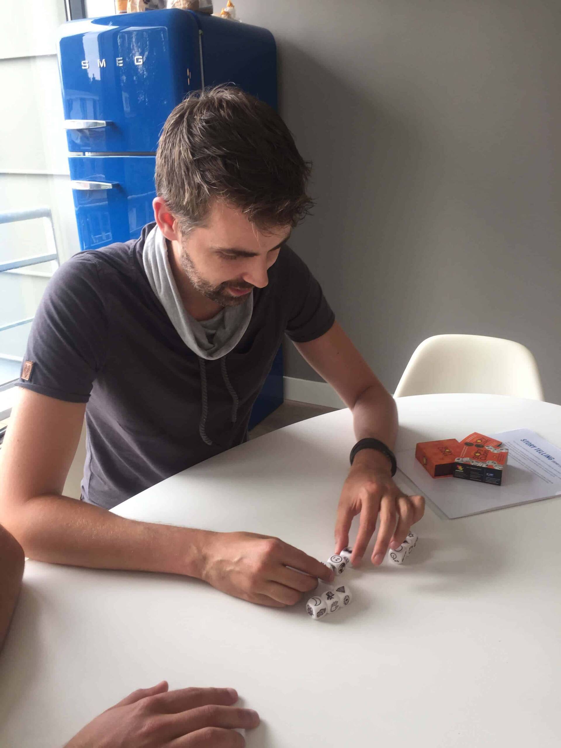 “Aan het begin van de week bepalen we de backlog. Ieder item op de backlog noemen we een ‘story’ en aan een story hangen ‘tasks’. Die taken kunnen verdeeld worden. Iedere story krijgt een aantal punten. Een punt wordt altijd gegeven op basis van hoelang er geschat wordt ergens mee bezig te zijn, maar ook van de moeilijkheidsgraad. Iets kan veel tijd kosten, maar relatief simpel zijn, daar wordt dan balans in gezocht. Dit maakt dat we elkaar beter kunnen helpen, want je hebt sneller in de gaten of iemand vastloopt. Als we ergens vijf punten aangeven en iemand is er twee dagen mee bezig, dan weet je dat er iets mis is. Daarnaast kom je dankzij deze manier van werken ook aan taken toe die je misschien zelf niet zou kiezen. Omdat je altijd van boven naar beneden werkt, krijgt iedereen stories toegewezen. Zo is een van onze webdevelopers tegenwoordig ook wel eens aan het ontwerpen en ik ben ook aan het programmeren. De specialiteiten worden meer verspreid.”