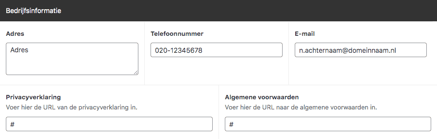 In de sectie “Bedrijfsinformatie” kan je de algemene bedrijfsinformatie aanpassen. Denk hierbij aan het adres van je bedrijf, e-mailadres en telefoonnummer. Maar ook de privacyverklaring en algemene voorwaarden kan je hier instellen. Deze gegevens worden doorgaans opgehaald voor de footer en de contactpagina. Let wel op dat telefoonnummers die handmatig in teksten worden gezet niet veranderen als je hier het telefoonnummer wijzigt. Ditzelfde geld voor het adres en e-mailadres.