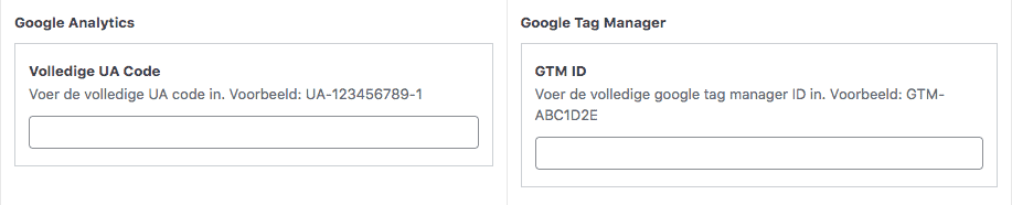 Naast het tabblad “Algemeen”, is er ook een tabblad genaamd “Google Services”. Als je op dit tabblad klikt verschijnen er twee opties. Je kan hier de Google Analytics UA code invullen of de GTM ID voor Google Tag Manager. De code die er voor nodig is om Google Analytics of Tag Manager te laden wordt dan automatisch toegevoegd aan je website.