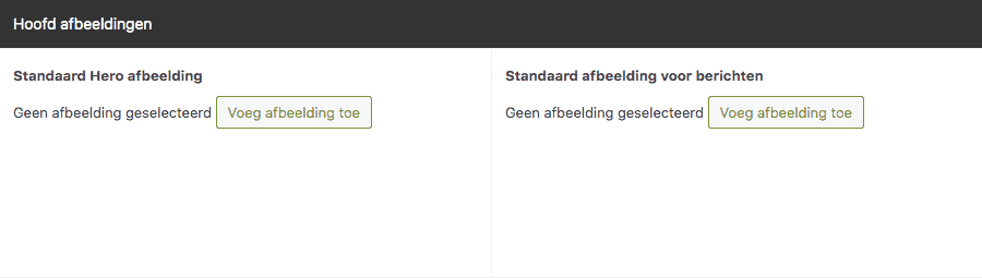 In de sectie “Hoofd afbeeldingen” kan je standaard afbeeldingen instellen voor pagina’s (Hero) en voor berichten. Het instellen van standaard hoofd afbeeldingen heeft als nut dat mocht je voor een pagina of blog bericht geen afbeelding hebben of er gaat iets anders fout, er altijd een backup afbeelding getoond kan worden. Je kan een standaard afbeelding selecteren uit de mediabibliotheek of via de mediabibliotheek uploaden.