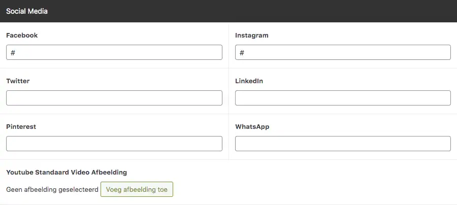 In de sectie “Social Media” kan je alles met betrekking van Social Media instellen. Het gaat hierbij om de links naar je Social Media kanalen. Wanneer deze worden ingevuld zullen ze automatisch verschijnen zoals ze ook in het ontwerp zijn aangegeven. Dit kan de footer zijn maar ook het menu of beide. Dit hangt per website af.