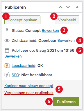- Concept opslaan: als je een bericht of pagina hebt geschreven en nog niet gepubliceerd, dan zie je de knop Concept opslaan staan. Hiermee sla je het artikel op zonder dat deze nog te zien is door je bezoekers. Als je artikel al gepubliceerd is dan staat deze knop er niet meer.